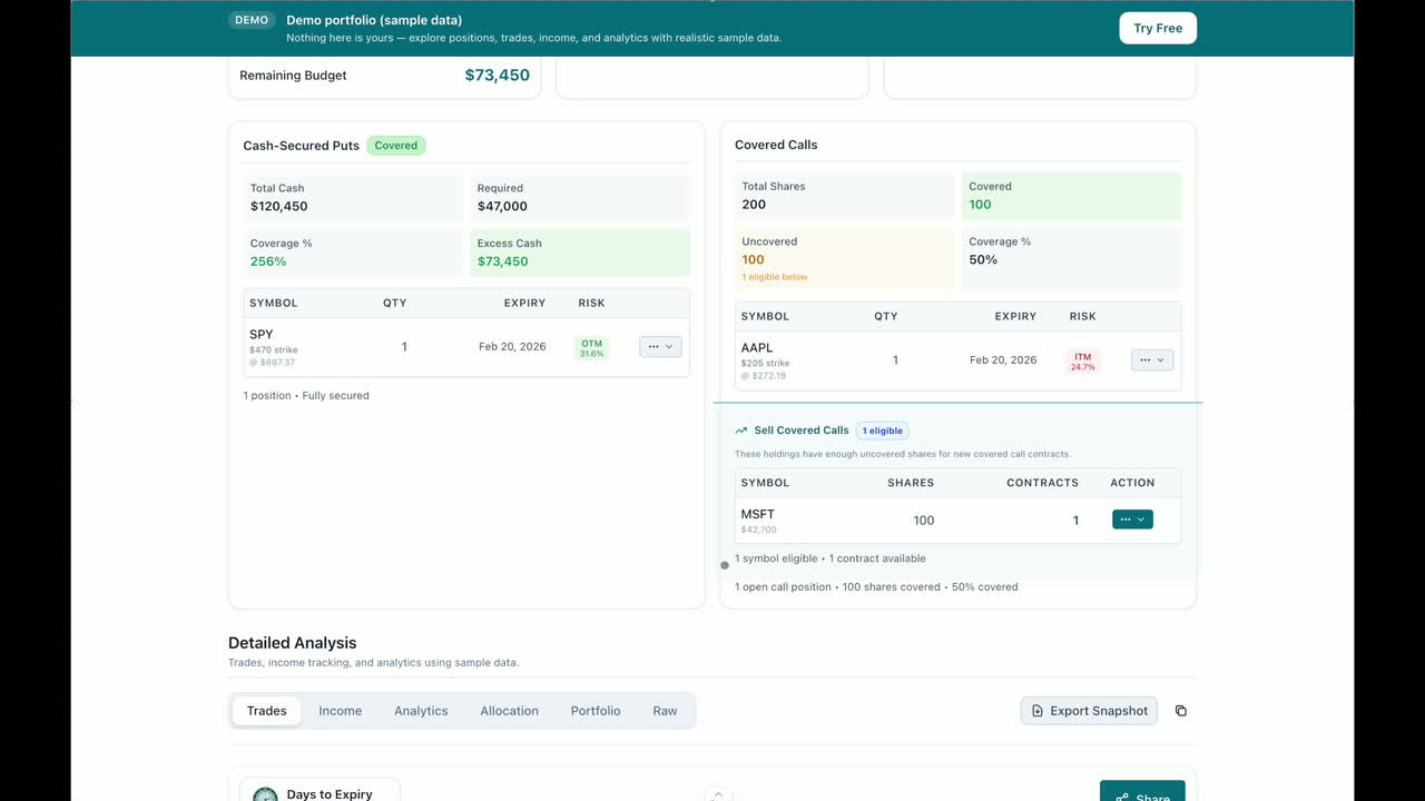 Scan covered calls, cash-secured puts, and LEAPS across your tickers. Filter by ROI, DTE, OTM%, and assignment risk. Compare setups side-by-side with live pricing.